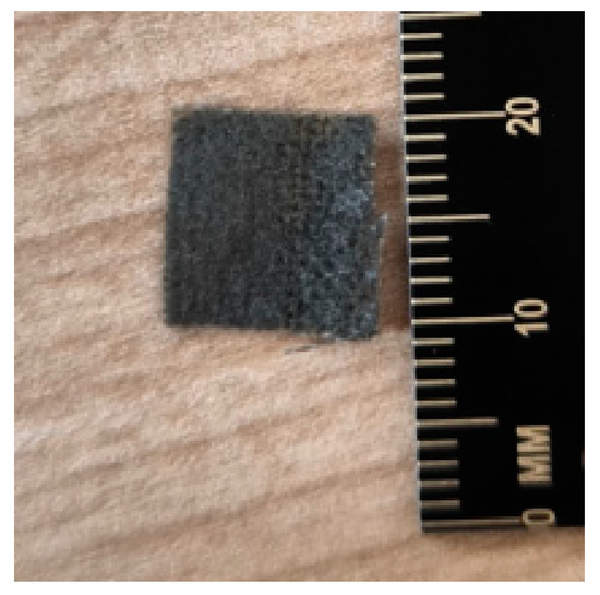 Figure 8 shows the second part of the tactile sensor (rGO). There are fabric squares with reconstituted graphene after calcining in the furnace. In order to determine the correct operation of the sensor, the following actions were performed: firstly, the uniform coverage of the pile fabric with graphene was evaluated through the use of a microscope, and secondly, the resistance on each piece of fabric used in the fabrication of sensors was checked with a multimeter. The measurements were made in random places on the entire surface, and their stability indicated the suitability of the obtained material as the second part of the tactile sensor (rGO). The obtained fabric is illustrated in Figure 8 and Figure 9.