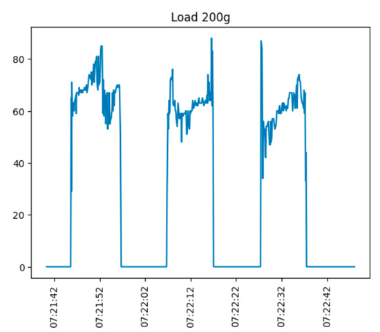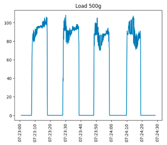 Figure 12 and Figure 13 demonstrate the sensor testing under load. Weights of 200 and 500 g were placed on the sensor at any moment and removed. The experiment was repeated 3–4 times.