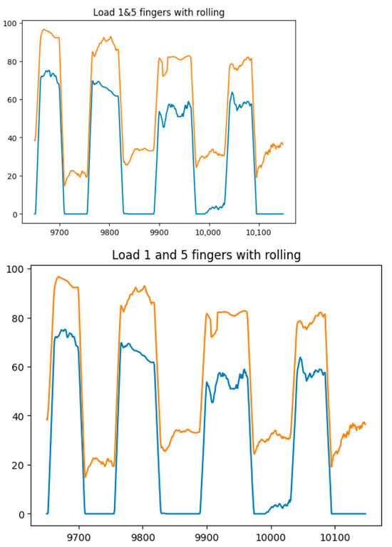 Graphs of alternating finger closings (1 (blue line) and 5 (orange line) fingers).