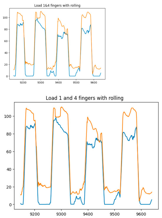 Graphs of alternating finger closings (1 (blue line) and 4 (orange line) fingers).
