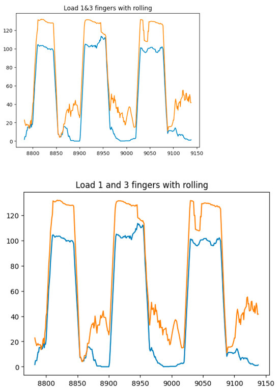 Graphs of alternating finger closings (1 (blue line) and 3 (orange line) fingers).