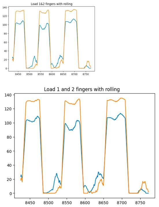 Graphs of alternating finger closings (1 (blue line) and 2 (orange line) fingers).