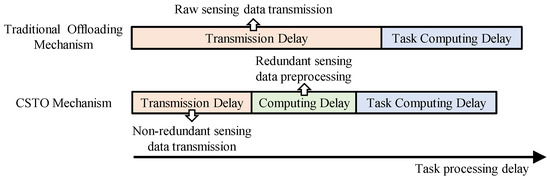 According to the CSTO mechanism, when the vehicle performs task offloading, it only needs to transmit the sensing data that are not redundant with the RSU n. Therefore, the transmission delay from the vehicle to the RSU n can be expressed as