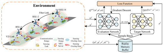 - Action: The action is denoted as , representing the task offloading decision. Given the current system state, a = 0 denotes that vehicle computes the tasks locally. a = n indicates that the tasks of vehicle are offloaded to the associated RSU n for processing, while means that the tasks are offloaded to RSU v through RSU n for processing.