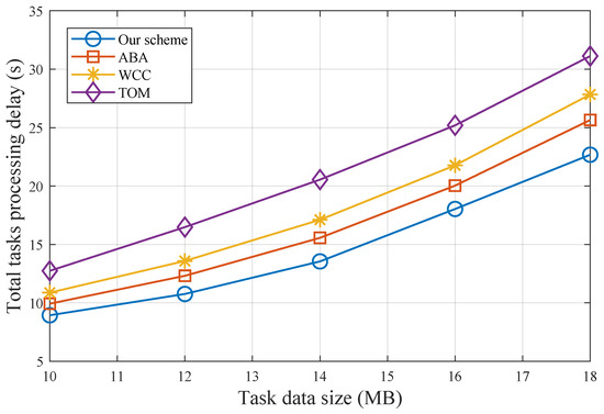 Figure 4 shows the total task processing delay for varying task data sizes. As the task data size increases, the task processing delay for TOM rises sharply due to the significant transmission delay caused by offloading raw data to the RSU. The lack of bandwidth allocation optimization and RSU collaborative computing leads to the inferior performance of ABA and WCC compared to our scheme. Notably, our scheme exhibits robustness in handling large-scale input data. For example, when the task data size is 18 MB, our scheme reduces the total task processing delay by 13.1%, 25.3%, and 37.2% compared to ABA, WCC, and TOM, respectively.