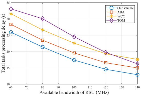 Figure 5 describes the total task processing delay for varying available bandwidth of RSU. With limited bandwidth, all schemes tend to compute tasks locally, which increases the total processing delay. Our scheme consistently outperforms others by optimizing bandwidth allocation, and more importantly, leveraging the CSTO mechanism to further reduce task transmission delay. When the available bandwidth is sufficiently large, offloading raw data to the RSU does not incur significant transmission delay, causing the performance of TOM to approach that of our scheme.