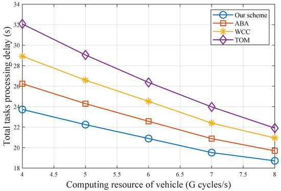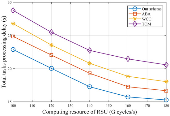 Figure 7 shows the total task processing delay for varying computational resources of vehicles. It can be observed that the total task processing delay for all schemes decreases as the computational resources of vehicles increase, with our scheme consistently outperforming the others. However, as computational resources increase, more tasks are processed locally, which gradually diminishes the advantage of our scheme.