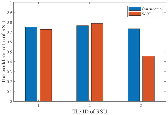 Figure 8 shows the RSU workload ratio with and without collaborative computation, where the RSU workload ratio is defined as the proportion of the required computational resources for tasks offloaded to the RSU relative to the total computational resources of the RSU. It can be observed that in our scheme, the workloads of the three RSUs are approximately equal, whereas in the WCC scheme, the workload of RSU3 is significantly lower than that of RSU1 and RSU2. The main reason is that our scheme considers RSU collaborative computing, enabling high-load RSUs (i.e., RSU1-2) to offload some sensing tasks to low-load RSU (i.e., RSU3), thereby maximizing the utilization of computing resources. In contrast, the WCC scheme lacks collaborative computing, leading to the underutilization of computing resources at RSU3.