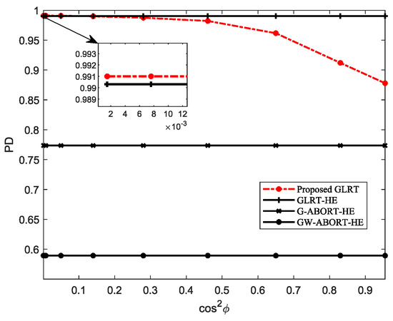 Figure 1 depicts the PD of the proposed GLRT under different . The result indicates that as the degree of mismatch of decreases (i.e., increases), the PD of the proposed GLRT initially exhibits a gradual decline, followed by a rapid drop. Compared to the GLRT-HE, the proposed GLRT exhibits a certain performance loss when is large, whereas it has a similar PD as the GLRT-HE or even a slight performance gain when is small. Regardless of what degree is the mismatched steering vector around , the proposed GLRT consistently outperforms the G-ABORT-HE and GW-ABORT-HE. In view of the above results, in subsequent simulations, we then consider three scenarios for : slight mismatch, moderate mismatch, and severe mismatch, labeled as GLRT-SL, GLRT-MO, and GLRT-SE, respectively. More specifically, we select , 0.4 and 0.6, corresponding to , 0.46, and 0.14.