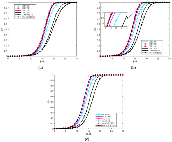 PD versus SNR for , and : (a) ; (b) ; (c) .