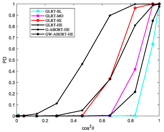 The PD versus for is reported in Figure 3. As observed, as the degree of signal mismatch intensifies, the GLRT-SL exhibits the fastest decline, indicating that it has the strongest selectivity compared to its natural competitors. The GLRT-MO demonstrates greater selectivity than the G-ABORT-HE but is less selective than the GW-ABORT-HE. For the GLRT-SE, the decrease in PD is slower than that of the G-ABORT-HE when (corresponding to ), and the GLRT-SE no longer provides a PD above 0.5 when . Therefore, the selectivity of GLRT-SE is inferior to that of the G-ABORT-HE. Notably, compared to the other two scenarios, considering as a slightly mismatched steering vector around enhances the ability to capture mismatched signals. As a result, when signal mismatch occurs, the detector is more likely to favor the null hypothesis, leading to the fastest rate of decline observed in the figure.