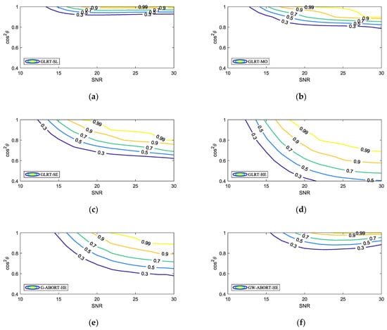 Contour of the PD versus SNR and for , and : (a) GLRT-SE; (b) GLRT-MO; (c) GLRT-SE; (d) GLRT-HE; (e) G-ABORT-HE; (f) GW-ABORT-HE.