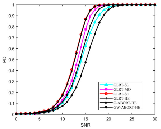 Figure 2 reports the PD versus SNR under matched conditions. It is clear that the GLRT-SE has the best behavior at , with a slight performance overrun compared to the GLRT-HE. As increases to , the PD of the GLRT-SE and GLRT-HE becomes nearly identical. The PD of GLRT-MO is between that of the GLRT-SL and GLRT-SE, and the GLRT-SE is more powerful than the G-ABORT-HE and GW-ABORT-HE. The findings align with those depicted in Figure 1.