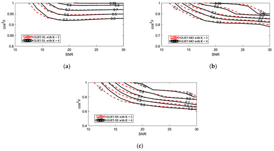 Comparison contours of the PD versus SNR and for and : (a) GLRT-SL; (b) GLRT-MO; (c) GLRT-SE.
