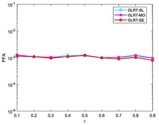 Figure 7 shows the CFAR property of the proposed GLRT against the noise covariance matrix. No matter how the correlation coefficient changes between 0.1 and 0.9, the PFA hardly changes, which indicates that the proposed GLRT is CFAR.