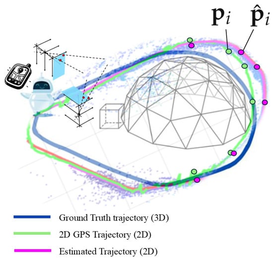 The MSE quantifies the average Euclidean distance, on the plane, between the matrix , collecting the reference key data points obtained by the GPS trajectories and the matrix of their estimated counterparts . The MSE is computed as: . The scale drift , a secondary metric, measures systematic scale deviations between estimated and GPS trajectories. It is defined as a function of the scale factor estimated through Helmert transformation, i.e., the scale factor computed as: