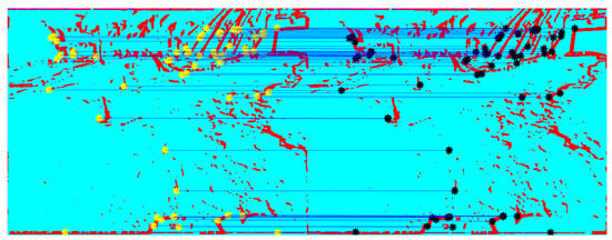 The stereo camera configuration features a 0.24 m baseline and a resolution of . Images are captured at 16 Hz, with the full stereo stream subsequently downsampled to extract stereo keyframes at intervals of approximately 0.2 m traveled []. The simulation parameters are as follows: (i) the maximum horizontal displacement between corresponding keypoints was limited to 48 pixels, equating to of the image width; (ii) the image pyramid employed a scale factor of 1.1 for size reduction; (iii) the pyramid included 10 levels.