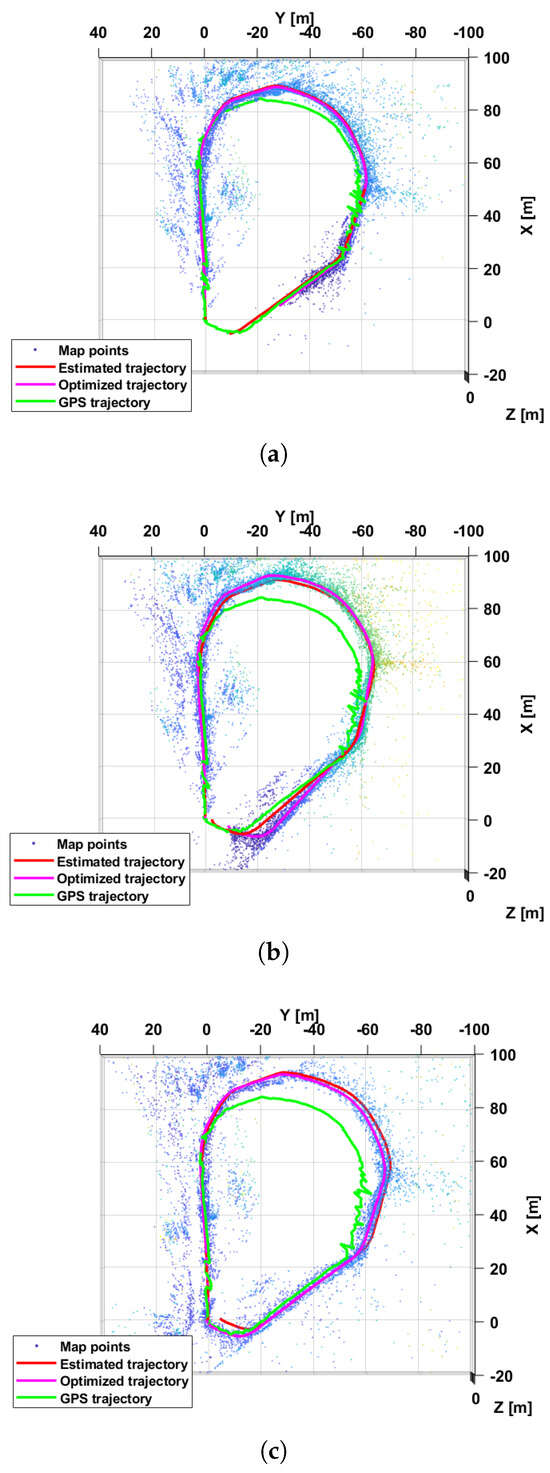 (a) Estimated and optimized trajectories (red, pink, respectively) obtained by VILD-SLAM operating on with and (b) , and ground-truth GPS trajectory (green). For the sake of comparison the (c) estimated and optimized trajectories (red, pink) obtained by the state-of-the-art algorithm in [] are also reported.