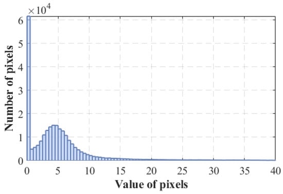 Implementing the CHF filter yielded both the magnitude and phase of the filtered image, followed by the magnitude thresholding and computation of the VILD maps . The threshold can be selected by analysis of the magnitude histogram, illustrated in Figure 9. We recognize the typical bimodal structure, with small values corresponding to noisy components in flat image areas, while large values correspond to sparse image structures.