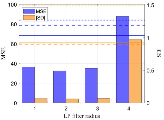 Mean squared error (MSE, left axis) and scale drift (SD, right axis) as a function of the low-pass (LP) filter radius. The blue bars represent the MSE, while the orange bars correspond to the absolute value of SD (|SD|). The horizontal lines indicate the reference MSE and |SD| values for the baseline ORB2-VSLAM method without any degradation; specifically, the solid, dashed, and dotted lines refer to the performance achieved using ORB, BRISK and SIFT features. This figure demonstrates the relationship between filter radius and trajectory performance, highlighting the impact of the image spatial bandwidth on the method accuracy.