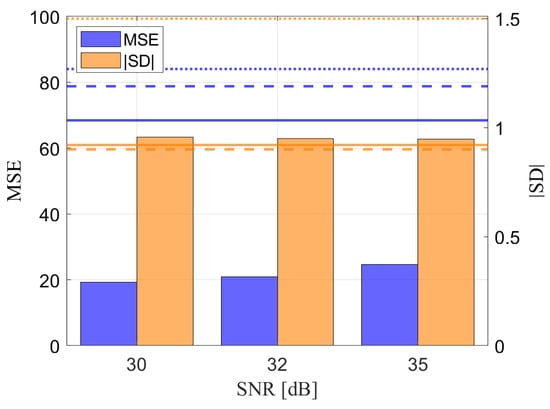 Mean squared error (MSE, left axis) and scale drift (SD, right axis) as a function of the SNR(dB). The blue bars represent the MSE, while the orange bars correspond to the absolute value of SD (|SD|). The horizontal lines indicate the reference MSE and |SD| values for the baseline ORB2-VSLAM method without any degradation; specifically, the solid, dashed, and dotted lines refer to the performance achieved using ORB, BRISK, and SIFT features, respectively. This figure demonstrates the relationship between SNR and trajectory estimation performance.
