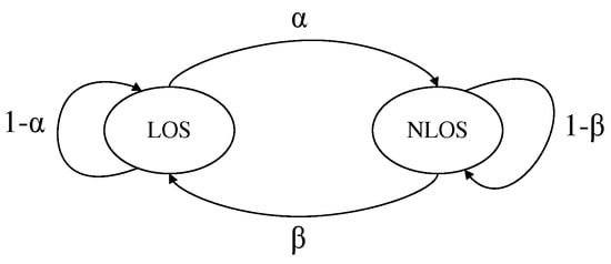 where is defined as in (13), is the proportion of NLOS errors at anchor i, is zero mean Gaussian distributed, and is mean-shifted Gaussian distributed. The mixed LOS/NLOS model is implemented using a two-state Markov process, which is the same as that mentioned in [,,,]. The state transition is shown in Figure 1.