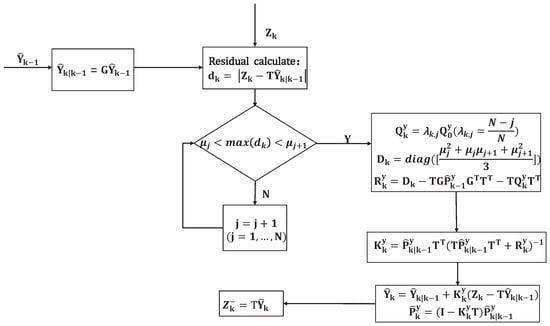 Equations (8) and (9) are update equations from the state to the k state, and (10), (11), and (12) are measurement update equations. is the error covariance matrix of , is the state transition matrix, is the process noise covariance matrix, is the measurement noise covariance matrix, is the measurement transition matrix, is the measurement matrix, and the weighting matrix is generally referred to as the Kalman gain matrix.