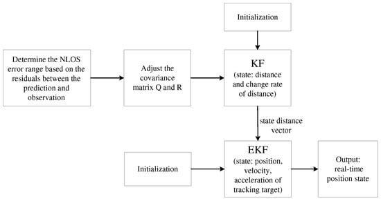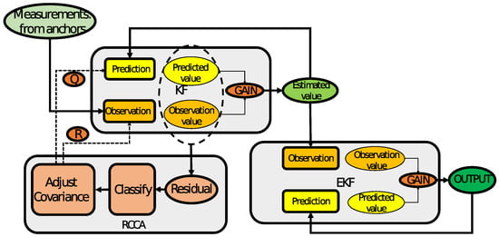 The main principle of RCCA is that the predicted value is obtained via a conventional filtering process through KF, and then, the residual between the predicted value and value (from the anchors) is obtained. The interval is classified according to the size of the residual, and the corresponding covariance matrix and observation noise covariance matrix are adjusted. Then, the results filtered by the KF are used as the input to the second EKF, which is used as the observation value and observation noise matrix of the EKF. The first-stage KF adjusts the covariance matrix through residual classification, to obtain more accurate observations for the second-stage EKF for further processing. The architecture of the overall system is shown in Figure 3.