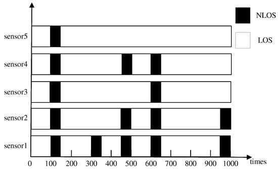 As mentioned in Section 2.2, uniformly distributed noise was chosen as the NLOS noise model. The NLOS noise model is described in Figure 5, where the black blocks represent the occupied time of the NLOS noise with uniformly distributed noise, and the white blocks represent the occupied time in the LOS environment. Both the NLOS and LOS environments also have Gaussian measurement noise with . The LOS/NLOS noise distribution for the five anchors in 1000 iteration times is shown in Figure 5.