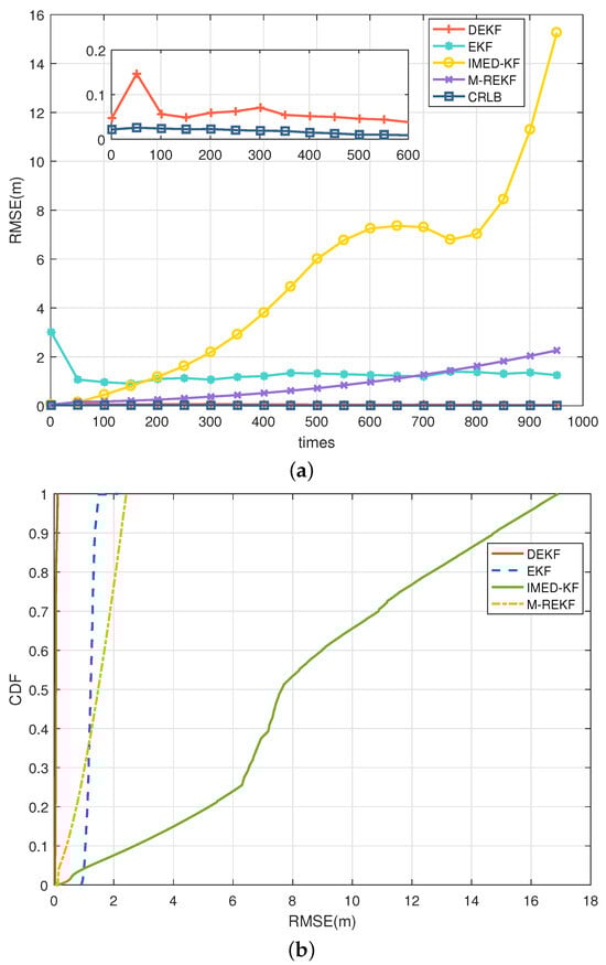 For generality, the CA model was used in the simulations, as shown in Figure 6, in which the RMSE and CDF of different filtering results are presented in the environment where the noise of all five anchors contains LOS only. In the LOS environment, EKF and the proposed DEKF can have a steady-ranging accuracy within 10 cm, while IMED-KF and M-REKF diverge during iteration. Using the two-state Markov chain described in Section 2.2 as the NLOS/LOS environment simulation model, four different scenarios, S1–S4, were set, and the NLOS noise distribution of the five anchors in different scenarios is as follows: