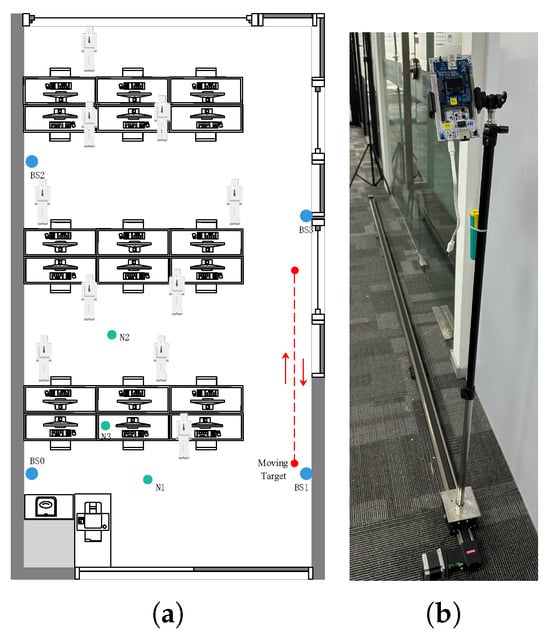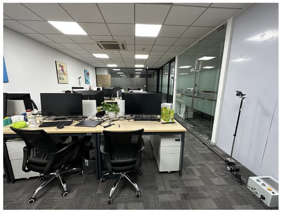 In order to test the performance of the proposed algorithm in a complex indoor environment, an experimental environment was built in our office using a UWB module, including four anchors and one target. The office area is about , and there were many people and some equipment in the office when these experiments were carried out, as shown in Figure 8.