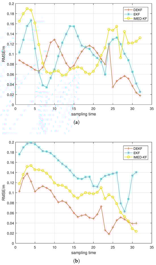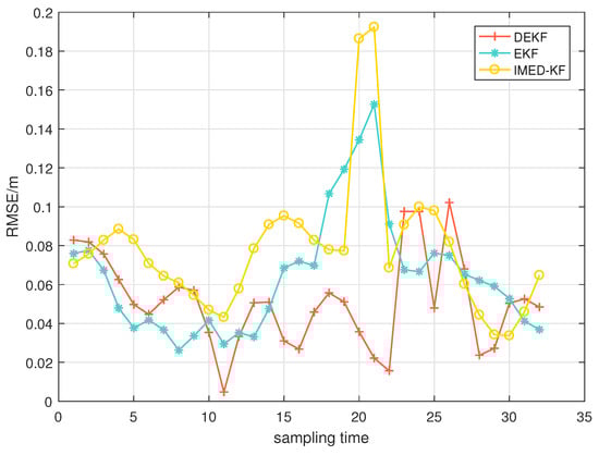 Figure 10 illustrates the RMSE values of several algorithms mentioned in the previous section for the LOS environment and the four NLOS cases. The RMSEs of these algorithms in the LOS environment are very close, under 10 cm, which means that the three algorithms are all accurate enough to achieve real-time tracking. In the four NLOS environment cases, the RMSEs of the three algorithms are relatively small, and the RMSE of DEKF is the smallest.