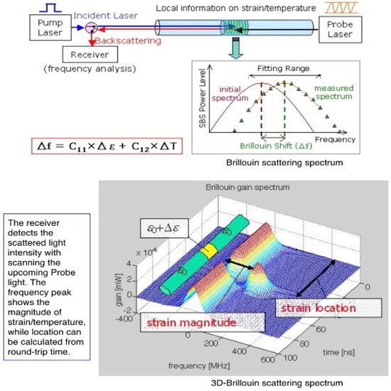 Principle of Brillouin Optical Time Domain Analysis (BOTDA) fiber optic sensor: mechanism of strain and temperature sensing through Brillouin frequency shift analysis [11].