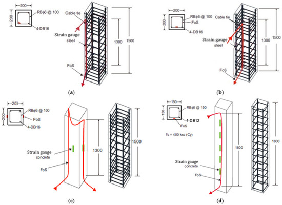 Steel rebars were used to connect the longitudinal bars and shear links. Figure 7 displays images of both columns with strain gauges and FOS. Changes in strain within the concrete columns were tracked using strain gauges. To achieve high strain measurement accuracy, the strain gauge installation procedure needed to be extremely precise. The installation of a strain gauge is depicted in Figure 7.