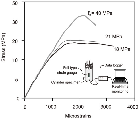 Stress–strain relationship of concrete obtained by foil type strain gauges (SGs).