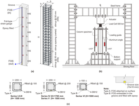 The experimental test matrix of the current study consisted of eighteen RC columns with different slenderness ratios and installation methods of BOTDA fiber optic sensors. In this experimental study, strain measurements of RC columns were carried out using both BOTDA fibers and strain gauges. The BOTDA fibers were installed in the RC columns in four different ways, such as (i) FOS placed only on the main reinforcement of the columns (Type A); (ii) FOS placed only on the shear reinforcement (Type B); (iii) FOS placed on the surface of the concrete (Type C); and (iv) grooves induced in the longitudinal direction of the RC column throughout the height and fibers placed onto the groove (near surface mounted—NSM and Type D). The dimensions and reinforcing details of all series of RC column are shown in Figure 2.