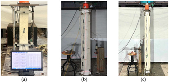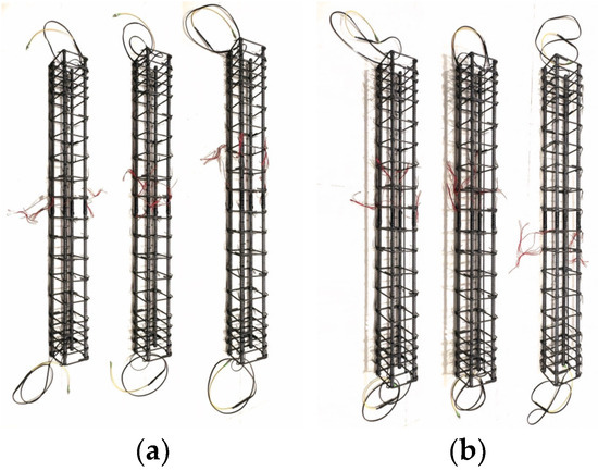To stop water from seeping through the concrete paste, the strain gauge was adhered to the rebar host’s immaculately polished surface using silicone glue. Ten strain gauges were mounted on the main steel reinforcement of the column, spaced about 100 mm apart for a column 1.8 m in height. One steel bar was inserted with three strain gauges at the midsection and at both ends, and three rebars had one strain gauge at the midsection of the column in the case of an RC column 1800 mm in height, as shown in Figure 7. To minimize the effects of temperature on the strain measurements, experiments were conducted under controlled environmental conditions, which helped to reduce fluctuations that could otherwise interfere with the precision of the BOTDA measurements.