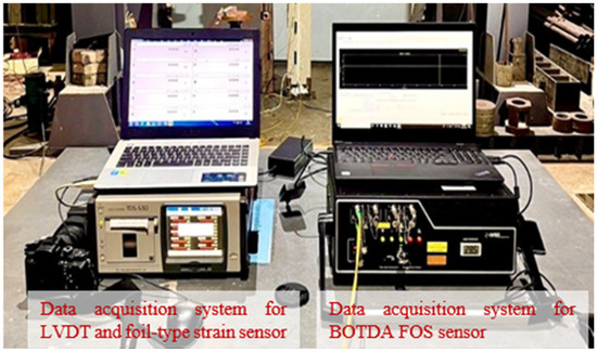 Typical view of data acquisition system for LVDT, as well as the foil-type strain sensor and BOTDA fiber optic sensor strain connection measuring system used in the study.