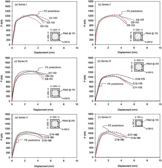 It can be inferred that, due to more efficient confinement, RC columns with the 1.5 m height can achieve superior structural performance when compared to RC columns with 1.7 m height when the volume ratio of reinforcement is well-designed. Similarly, in series VI, a prestressed concrete RC column was cast and tested under axial compression load, the load versus deflection curve of which is shown in Figure 8f. It was shown that the highly prestressed concrete column specimen did not fully develop the confinement effect of the reinforcement [27]. The concrete covers were all delaminated around the peak loads when all specimens were compared. All of the curves for the prestressed concrete columns resembled the RC columns in terms of shape and tendency to vary with the displacement. Additionally, it was shown that the prestressed concrete columns had a far smaller restricting impact than the axial-loaded columns compared to series I to V.