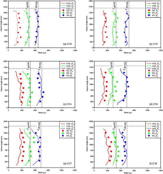 Column height versus strain vales from FOS and conventional strain gauges at 720 days. (a) C10−Series IV, (b) C10−Series IV, (c) C12−Series V, (d) C15−Series V, (e) C17−Series VI, and (f) C18−Series VI.