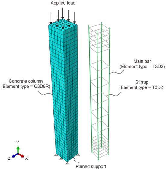 To gain deeper insight into the performance on RC columns, non-linear finite element analysis (FEA) was carried out using Abaqus® software (version 6.14). These investigations considered both geometric and material nonlinearities. The concrete of the RC column was modeled using 8-node linear brick elements, as shown in Figure 10. The concrete was modeled using a modified second-order integration technique and C3D8R solid elements. The main and shear reinforcements were modeled using 2-node linear 3D truss elements, as shown in Figure 10. The reinforcement steel bars were modeled using an element type T3D2. An 8 mm mesh size was chosen after an optimization of mesh sensitivity was performed in Abaqus® [31]. The boundary conditions of the RC columns were kept pinned at one end and free at another end as shown in Figure 10.