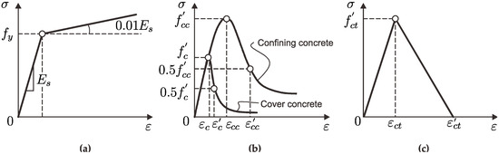 Constitutive relationships used in this numerical study. (a) Stress–strain of reinforcement steel. (b) Compressive stress–strain relationship. (c) Tensile stress–strain relationship.