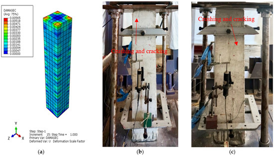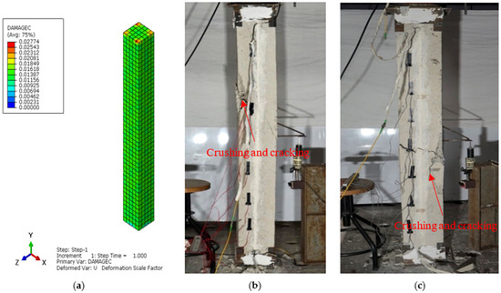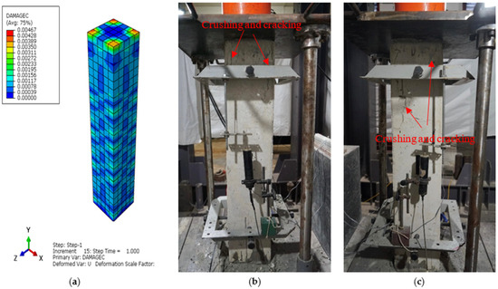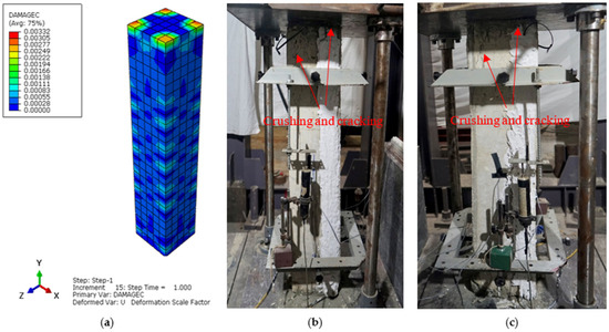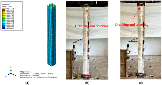 The stress–strain curve of concrete under tension is shown in Figure 11c. The uniaxial stress–strain models of RC columns were modeled in this finite element analysis. The value of stress (0.5f’c) in the stress–strain curve under axial compression indicates the point at which the concrete began to deviate from linear elastic behavior. The development of microcracks in the concrete matrix, a frequent feature at this site, led to a nonlinear stress–strain relationship. After that, as the pressure and tension grew, the concrete gradually lost its rigidity until it was close to breaking. The plastic zone was represented by strain softening beyond the ultimate stress and stress hardening up to the maximum stress (f’c). Under uniaxial tension, the stress–strain relationship was linear-elastic until the failure stress (f’t0), which is when microcracking began. Crack formation in the compression zone when subjected to axial loading was indicated by a softening stress–strain response that resulted in strain localization in the concrete structure beyond the failure stress. For the numerical analysis (Abaqus), creep and shrinkage effects were modeled as part of the material properties through time-dependent material models, which simulated these phenomena. The deterioration factor (e.g., damage indices DAMGEC and DAMGET) would be influenced by these time-dependent behaviors, where the stiffness and bearing capacity degradation would occur more rapidly because of creep and shrinkage over time.