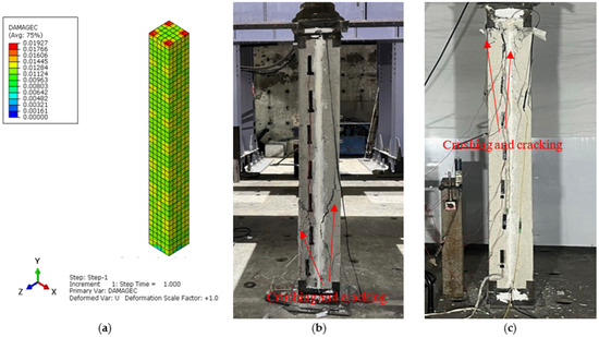 Damage index analysis of RC column—C12 series IV. (a) DAMGEC. (b) Cracking pattern of C12-170 column at ultimate load. (c) Cracking pattern of C12-170 column at failure load.