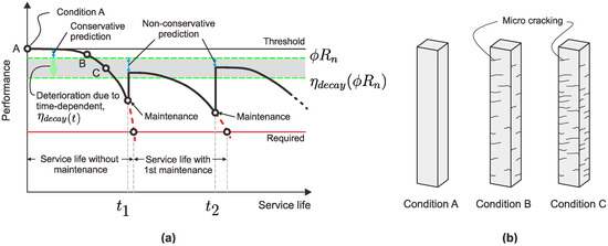 Performance of service life predictions of RC columns through ACI 318 and Eurocode 2: (a) life cycles of RC elements and (b) decay in performance due to time-dependent deterioration effect.