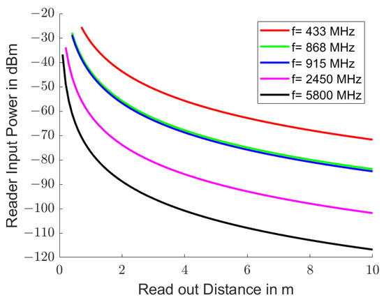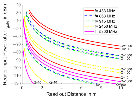 Figure 3 shows the initial received power at the end of stimulation in the reader for ISM [41] and SRD [42] bands that are often used to read passive resonant transponders. The initial received powers are independent of the quality factor Q of the resonator. Free space electromagnetic propagation was assumed with , , , , i.e., an stimulation at resonance frequency, and , i.e., an excitation via Q oscillations. The curves are shown from a distance between the reader and transponder of .