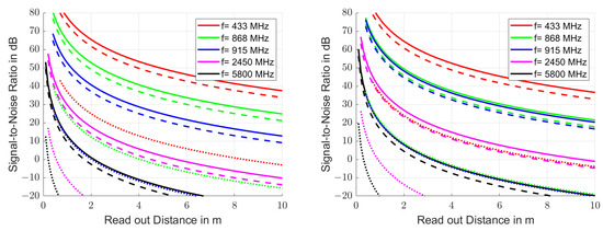Remaining signal-to-noise ratio in the reader after the time gate at the start of the sampling. The same frequency ranges and resonator qualities were used as in Figure 5. The noise bandwidths in the left graph were selected according to the regulations for the ISM [41] and SRD [42] bands, to 1.75 MHz for the 433 MHz band (red line), 2 MHz for the 868 MHz band (green line), 26 MHz for the 915 MHz band (blue line), 100 MHz for the 2.45 GHz band (magenta line) and 150 MHz for the 5.8 GHz band (black line). The resonator quality factors used were 1000 (solid line), 100 (dashed line) and 10 (dotted line). In the right graph, constant relative bandwidths of of the carrier frequency are assumed. All other parameters correspond to those in Figure 3.