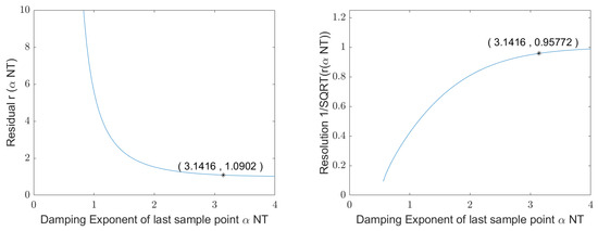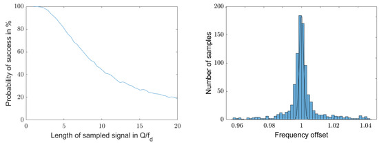 The second part of the above equation only scales the result and can be summarized into a constant. Figure A1 visualizes Equation (A50) for a resonator with a quality factor of 100 and a resonance frequency of 1 Hz. In the left graph, the quality factor of the communication channel was set to 10, i.e., , and . We see a minimum in after 85.75 oscillations, i.e., the oscillator was not fully charged, and sampling is stopped before the resonator has completely settled. The gain from starting a new measurement and then averaging the data results in slightly higher accuracy than fully exciting the oscillator and sampling the entire decay. However, the graph is very flat between 0.85 and 1.0 and only differs by 1%. Fully loading and sampling the oscillation might lower Fresnel ripples in the spectrum.