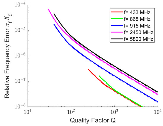 E. Aboutanios presented an iterative, high-performance algorithm which approximates the points around the maximum of the measured spectrum by a Lorentz curve, thereby reaching an accuracy of the Crámer–Rao lower bounds [39,40]. Using this algorithm, several examples of the achievable accuracy are shown for wireless readout of resonators of different quality factors in typical ISM (Industrial, Scientific, Medical, ISM) [41] and SRD (Short-Range Device, SRD) [42] bands as a function of read distance or signal-to-noise ratio.