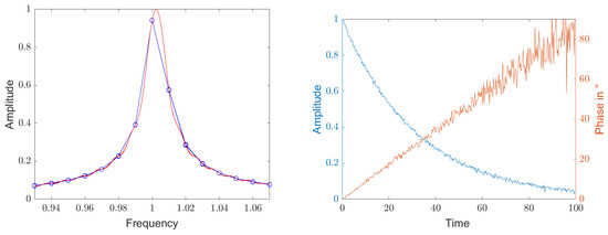 The signal with power in Equation (13) usually is boosted with a low-noise amplifier and then mixed down to baseband with the actual local oscillator signal and sampled. Depending on the distance between the stimulating frequency and the natural frequency of the resonator , the down mixed signal only shows a few oscillations before it disappears into noise.